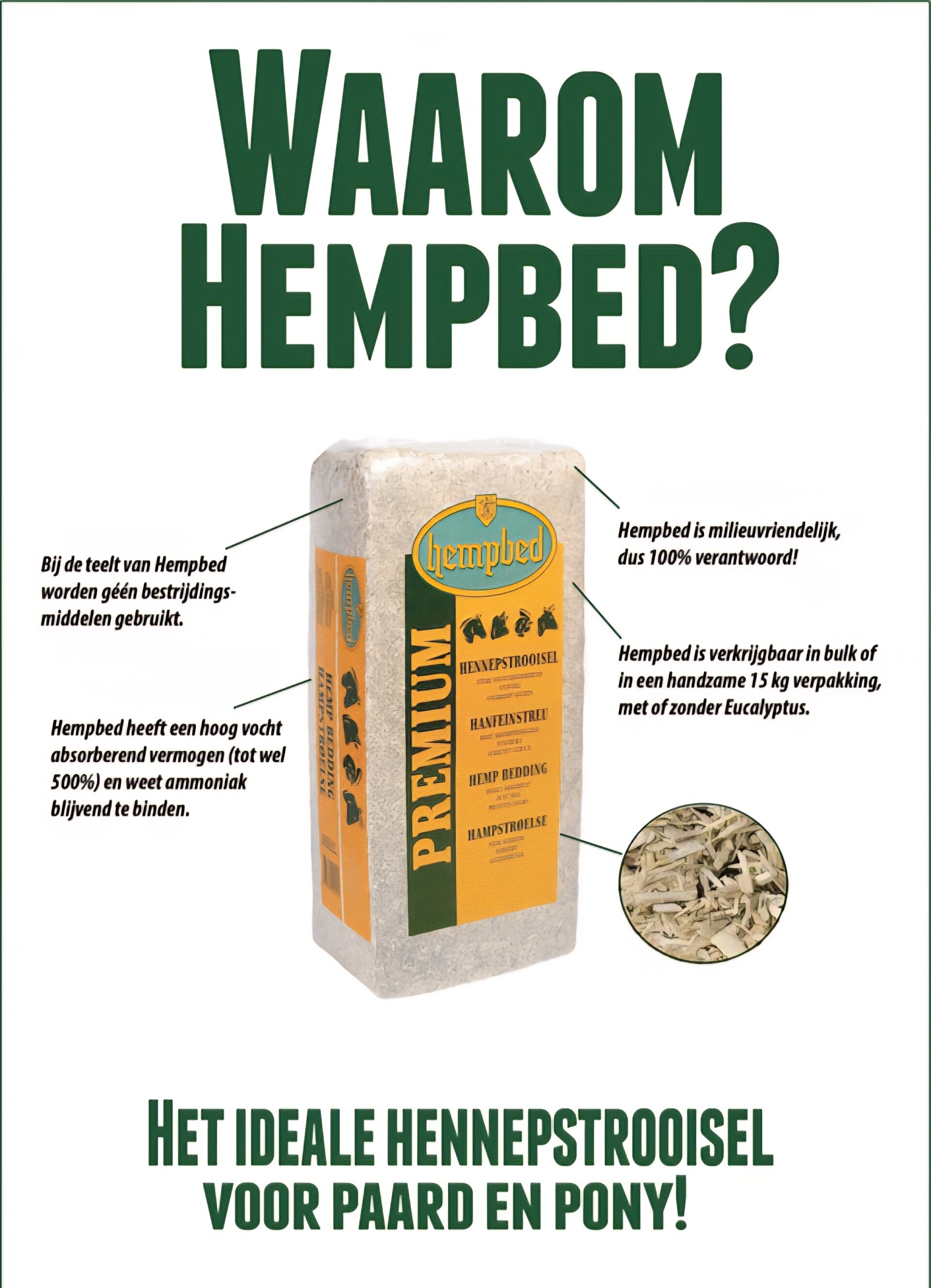 Hennephout heeft van nature een groot absorptievermogen, waardoor vocht, geurtjes en ammoniak snel worden opgenomen door het Hempbed. Hempbed hennepstrooisel is nagenoeg stofvrij en is daardoor ook erg geschikt voor paarden en pony’s met luchtwegproblemen. Uiteraard is ons Hempbed ook zeer geschikt als bodembedekking voor (klein)vee, knaagdieren en vogels.